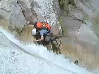 やがて頭上が晴れてきて上に3段滝が見えてくる頃には、もはや水はほとんど涸れており稜線も近づいていることがわかります。かなり消耗してきた身体にムチ打って二俣からいったん右手に入り、そのまま左に続く巻き道を登ると、道は上段の滝のすぐ下に通じるバンドへの入口に出ました。そこからも左岸の巻き道は上へ続いていそうですが、我々はこのバンドを右岸に渡って最後の滝登りにチャレンジすることにしました。出だしがちょっとしょっぱい段差のあるスラブで、Niizawa氏にビレイをお願いして私がまたリードです。