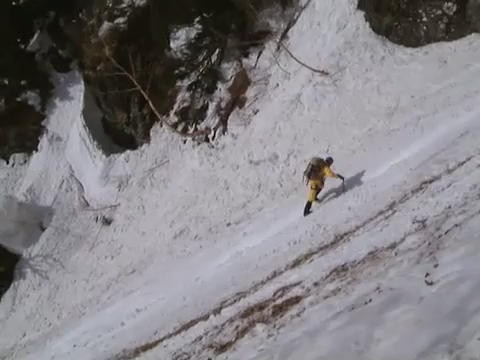 また(これもたぶん)P13は踏み跡が左の急斜面を横切っていて実際こちらしか行けそうにありませんが、時刻は15時すぎで雪はすっかり腐っており、先行しかけたNiizawa氏は進むたびに足元の雪が崩れて四苦八苦しています。そこで手前のハイマツでビレイをとり、私のリードでロープを伸ばしましたが、岩と雪壁との接点から思い切って離れて横に進めばこの雪壁もしっかり我々の重さを支えてくれて、なんとか無事にここを通過できました。