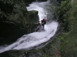 かっしいにビレイを頼み、デチはロープの真ん中に結び目を作って安全環付ビナでハーネスに結びつけてから登ってみました。ホールドは適度にあって手持ちのビナを節約しながら抜けられるかなと思いましたが、ワンポイントだけランナーなしでは不安になる箇所あり。なんとかぴったり15mで支点を作ることができ、デチ・かっしいの順に登ってきてもらいます。足場の不安定な登攀は経験がない2人でしたが、かっしいが一度ずりっと落ちかけただけで無事に上がってきてくれました。ところが我々が登っている途中でやってきた後続パーティーは、我々とは反対の右岸を斜上し、ゴルジュ滝の先から懸垂下降でさっさと下っています。しまった、先行パーティーにだまされた!と思っても後の祭りで、仕方なくもう1ピッチ水平にロープを伸ばしてから安定した土のバンドを大滝の上へ出ました。