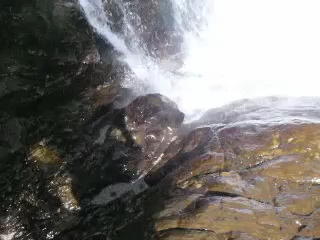 行動再開。これも立派なF13の巻きは右(左岸)を上がりましたが、落ち口に向かうトラバースラインは途中で崩壊していて非常に微妙。んー、と考え込みながら辺りを見回すと、わずかに戻り気味に1段上がるランペがあり、そちらを経由すると土のバンドが滝の落ち口の上まで続いていました。