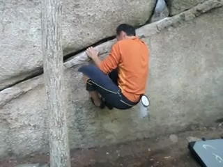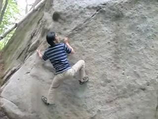 ひとしきりクジラ岩で遊んでから、現場監督氏とムラタ氏はホワイト・ブロック、私はSakurai師に連れられてタイコへ。こちらではきれいな丸いフレークをレイバック〜スメアで上がる「太鼓」(8級)をFLしましたが、手本を見せてくれたのはSakurai師ではなく先にこの岩に取り組んでいた家族のやはりちびっ子ボルダラーでした。先日の御岳渓谷でも小さな子供が裸足のままで6級の課題をすいすい登る場面に立ち会いましたが、この子たちが大きくなったらどうなってしまうのか、しかし特異な負荷がかかるこのスポーツを成長期に達していない子供にさせて大丈夫なのかどうか、などといろいろ考え込んでしまいました。