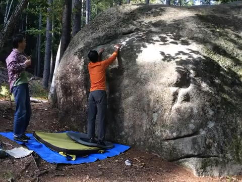 13時頃には駐車場に戻ったのですが、雨月岩あたりでよっこさんが3級課題に熱くなり、終わらなくなってしまった模様でした。一度は現場監督氏ともども探しに行ったのですが、探している我々が道に迷ってしまい、人を見つけては「ここは何岩ですか?」を繰り返す始末。マジでリングワンデリングになるかと思われましたが、「石の魂」を見つけたところでやっと現在位置を確認でき、そこから「もう下ったのかなあ?」とボヤキながら駐車場に戻りました。しかるに再び連絡があったよっこさんのメッセージは「15時半まで登りたい」。お客さん、延長ですか。仕方ないなあと再び林の中へ向かった現場監督氏の背中を見送りつつ、私は駐車場近くの岩の上で昼寝にかかりました。