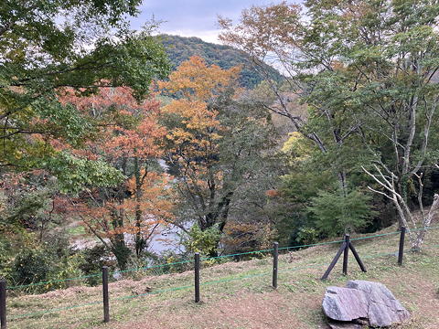 菅谷館跡の中をひととおり歩いたら、武蔵嵐山の穏やかな里の景色の中を歩いて嵐山渓谷に向かいました。ここは堂平山から流れ下る槻川が大平山に西からぶつかり南に伸びた尾根を大きく迂回してから東進する位置にあって、岩畳の渓谷と紅葉や赤松林の美しさとから京都の嵐山になぞらえて昭和初期に「武蔵国の嵐山」と呼ばれるようになったところです。実は東武東上線の武蔵嵐山駅も、この景勝地が評判をとったことにより昭和10年に菅谷駅から武蔵嵐山駅に改名されたのだそう。