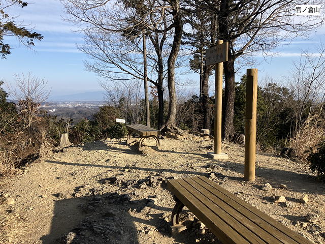 官ノ倉山の山頂の少し手前からは、木の間越しに笠山と堂平山が見えました。標高は堂平山の方が40mほど高いのですが、笠山はその名の通りの特徴的な山容で麓からでも縦走路の途中からでもよく目立ち、山頂に神社が建てられたのも納得です。