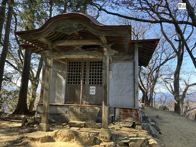 車道歩きと山道歩きをつなげてそこそこの時間をかけて、ようやく笠山に到着しました。ただしこの山の標識があるところは本当の山頂ではなく、すぐ近くの笠山神社が建つピークが最高地点なので当然そちらに足を伸ばしたのですが、ちょうどそのとき神社の前にいた男性2人組は元気よく腕を振りながらそこにある石碑に彫られた校歌(麓の小学校の校歌らしい)に適当な節をつけて歌っていました。私が近づくと「あ、すみません」と照れ笑いをしながら挨拶してくれましたが、どうやらその五七調の歌詞を自分たちが卒業した学校の校歌のメロディーにあてはめて歌っていた模様。楽しそうでいいなぁ。かたやこちらは、この時点で正午になっていることで時間的に不安を覚え始めていました。これは「コンパス」で提出した登山届に記載した計画タイムとほぼ同じではあるものの、皮算用としてはもっと短縮できるつもりだったのですが……。