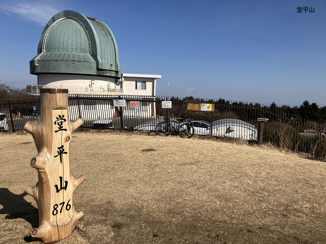 笠山から下って登り返して、すぐに堂平山に到着。先ほどの笠山から堂平山、剣ヶ峰を経て大霧山までは昨年12月の比企三山歩きのコースを逆に辿ることになります。そのときと同様に今日の堂平山山頂からの広い展望も気分のよいもので、西の方にはこの後ぐるっと回って縦走することになる尾根が見えていましたが、前回は閑散としていた山頂に、この日はとりわけ自転車乗りの人たちが大勢たむろしていました。