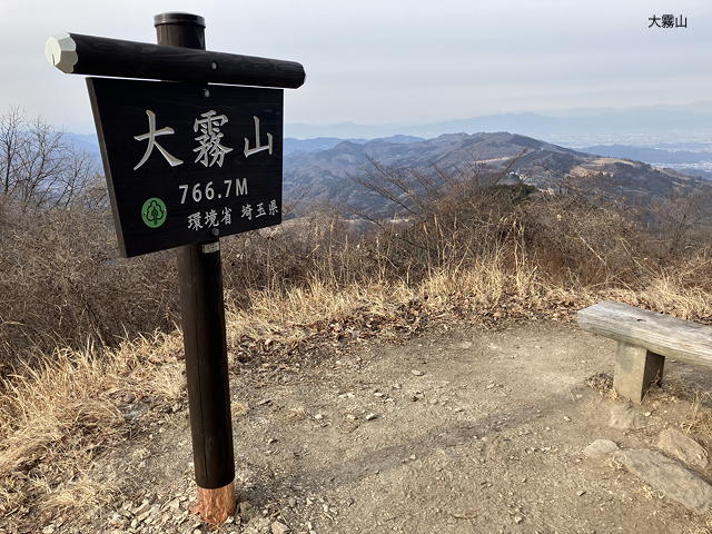 定峰峠から旧定峰峠を経て大霧山に達する頃には天気予報通りに空に薄雲が広がり始めており、前回ここからきれいに見られた遠くの山の展望もすっかり霞んでしまって魅力半減です。それでもここでベンチに腰を落ち着けて、行動食として持参したカレーパンと道の駅で買い求めたバナナの最後の1本を腹に収めました。ここは外秩父七峰のうちの第五峰ですが、残る二つの山は車道歩きの途中でちょっと立ち寄るピークといった感じになってしまうので、いわゆる登山気分を味わえるのはこの大霧山が最後ということになります。