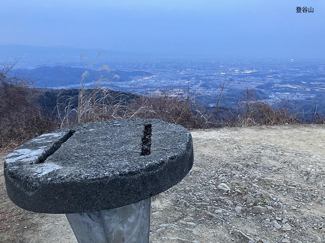 皇鈴山からさらに北へ進んでいったん車道に降りた後、再び山道を辿れば七峰最後の登谷山とやさんの山頂です。ここには他の山にあったような標柱はなく、近くの木に小さい山名標識がネジでとめられているだけでしたが、下界の眺めは悪くありません。そして見下ろした北武蔵の平地には、すでにたくさんの灯りがともる夜景が広がり始めていました。