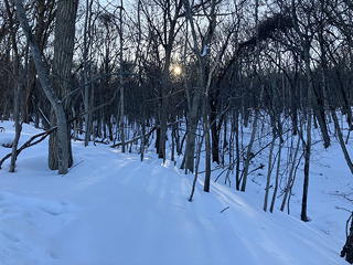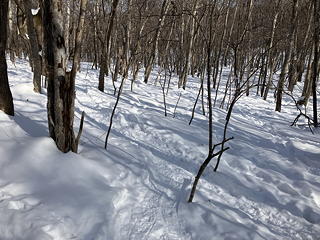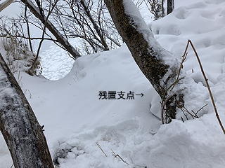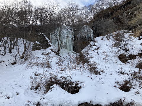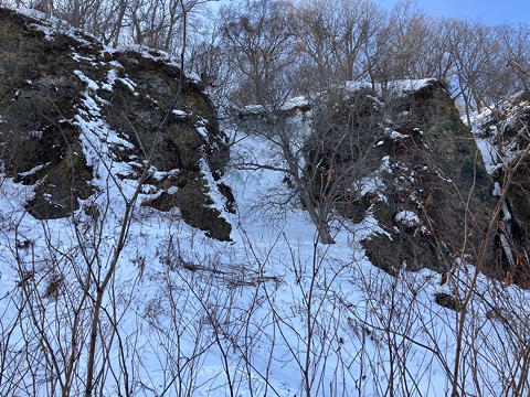 続いてメノコがあるはずですが、岩壁にぼんやりと切れ込んだ凹部が複数あって同定に確信が持てません。たぶんこれかな?という斜面は確かに凍っているものの、傾斜が緩いだけに雪をかぶっていてこれもイマイチ。