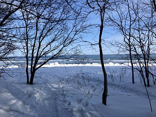 能取岬と網走市街を結ぶ網走公園線から海岸へは、森の中の雪原を歩き沢筋をまたいで斜面を斜めに下ることになりますが、幸いよく踏まれていてシューズがもぐることはほとんどなく、スムーズに海辺に出ることができました。この道筋にはアイスクライマーも入っているでしょうが、むしろスノーシューを履いての流氷見物のガイドツアーの方が多そうです。