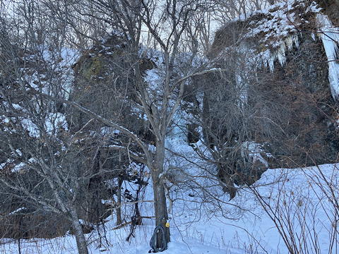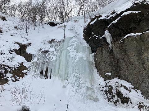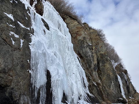 今年のオホーツク海の流氷到来は記録的な遅さで、網走地方気象台によれば流氷初日(視界内に流氷が見えた日)は2月15日、流氷接岸初日は2月17日だったそう。前者は1946年の観測開始以来最も遅い記録、後者は観測史上4番目に遅い記録です。こんな具合に時間を使っているうちに連絡が入り、どうやらアイスクライミングをしても大丈夫だという状況になりました。とはいうもののすでに正午を回っているので、この日は明日・明後日のための偵察に時間を使うことにしました。