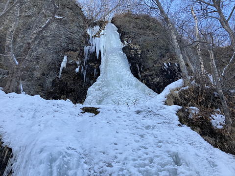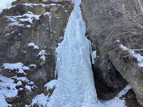 そんなわけで無事に対面できたオジロの滝は、前回来たときと比べると氷の発達が弱く、ちょっと嫌な感じ。それでも見上げてみると一応ラインは見えたので、明日・明後日の中でチャンスが得られれば登ってみることにします。