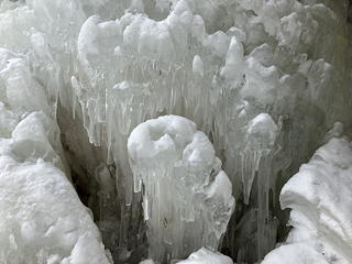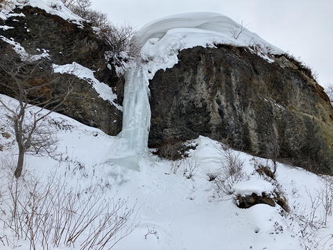 網走市街から氷瀑群の入口までの道も除雪されておらず、駐車場所には先客の姿もありません。悲壮感を漂わせながら装備を身につけてはみたものの、これは早めに退散した方が無難そうです。そこで予定を変更し、道路から滝の落ち口までの距離が最も短いオコジョの滝(最南端)に向かうことにしました。