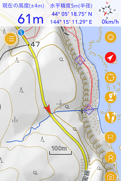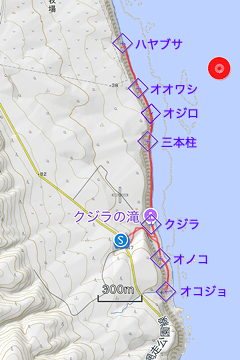 概要:7年ぶりに能取岬の氷瀑でアイスクライミング。初日は氷瀑偵察、2日目はクジラの滝とオオワシの滝、3日目はオコジョの滝。下図の軌跡は初日の氷瀑偵察時のもの。