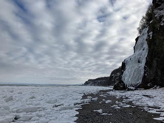 羽田を7時に飛び立ち女満別に9時前に到着して、空港でノダ氏と半年ぶりの合流。ただちに網走市内に移動してコンビニエンスストアに立ち寄り、軽く朝食をとりがてら行動食を買い求めたのですが、さあこれからというところでほぼ同時にノダ氏と私に電話が入りました。仔細は省きますがどちらも家族絡みのアクシデントの一報で、特に私の方はいつでも電話に出られる状態を維持しなければならなくなってしまいました。このためにアイスクライミングは続報あるまでお預けとせざるを得ず、しばらくは観光モードで時間をつぶすしかありません。そのため、まずは網走川の河口近くにあるモヨロ貝塚館を訪れてオホーツク文化についての知見を広め、ついで能取岬に車を飛ばして流氷を見物しました。