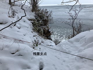 オコジョの滝を確認したら反転し、海岸に降り立ったところから今度は北に向かうと最初に目に入るのがクジラの滝。先ほど雪の林の中を歩いてまたいだ沢筋から落ちているのがこの滝です。我々がここに着いたときにはトップロープが張られていて、2人組が休憩をしていました。よし、明日は朝一番でこの滝の上から懸垂下降だ。