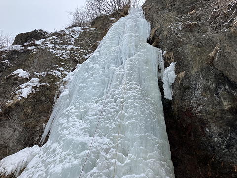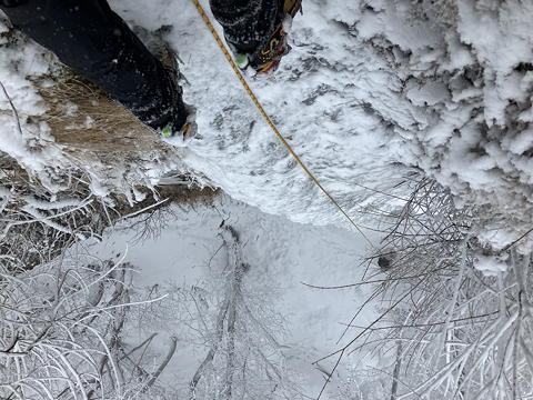 ロープ2本を繋いで支点にセットし、滝の下まで懸垂下降。下りながら観察すると特に落ち口の下の10mほどはほぼ垂直に立っており、これは自分にはリード困難だぞという感じ。しかしトポにあるこの滝はシーズンを通して状態が悪い