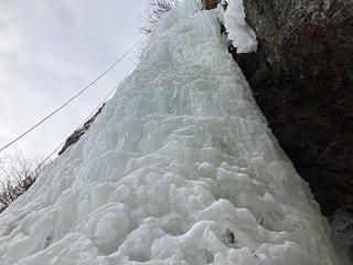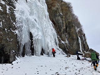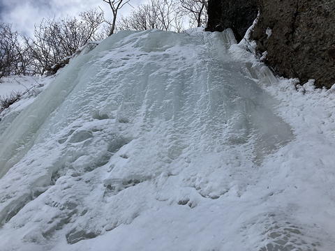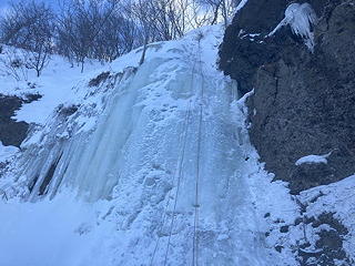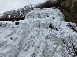 という記述とは裏腹にしっかりと凍っている印象です。ただ、最上部の垂直の10m強は自分たちには歯が立ちそうになく、登るならトップロープでと目星をつけました。