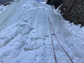 と記していますが、これは誤りだということです)。もちろん60mロープの方がベターだったでしょうが、それでもどうにかトップロープで登ることができました。私とノダ氏でそれぞれ2回TRで登るうちに氷の状態や形状がつかめ、これならリードで行けるという確信を得られたので、3本目はリードすることにしました。