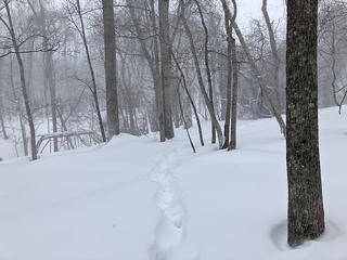 車を駐めた場所から南に向かって道路を少し歩き、沢筋に橋が架かるところに行き着くと左岸にうっすらと踏み跡が残っていました。これを辿るとほとんどラッセルすることなくオコジョの滝の落ち口に達することができ、そこにはクジラの滝と同様に懸垂下降支点が設えられていました。