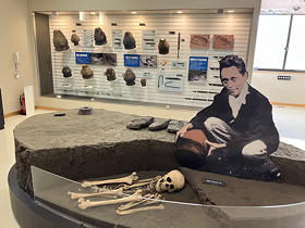 2日前にモヨロ貝塚館で学習したオホーツク文化ばかりでなく、1万年以上前の旧石器時代に始まり縄文時代、続縄文、擦文を経てアイヌへとつながる近世以前の歴史が手際よくまとめられ、網走周辺の遺跡分布図も目を引くものでした。ここで特に注目したのは二つの頭骨で、縄文人の頭骨は顔が四角く眉間が盛り上がり、鼻筋のとおった目鼻立ちのくっきりした顔つき