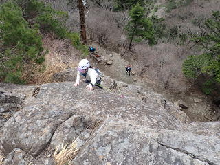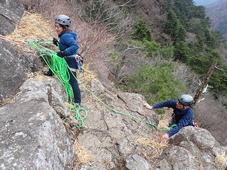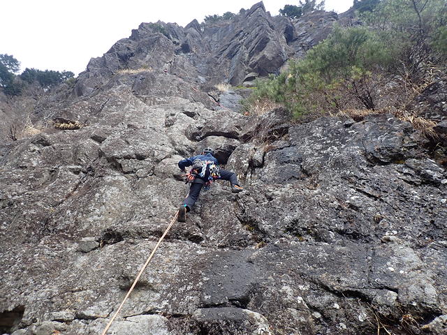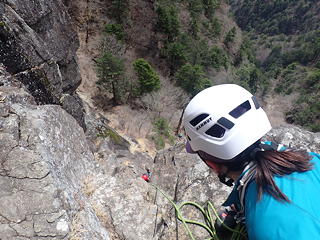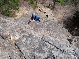 後続の相模太郎・ヒミカペアは、奇数ピッチをヒミカさん、偶数ピッチを相模太郎氏が担当するツルベでの登攀です。ヒミカさんはフリークライミング能力がこの日のメンバーの中では最も高く、また広沢寺でマルチピッチを練習した経験もあるものの、こうした本チャン(死語)に近い場所での登攀は初めてということなので、彼女が支点構築する場面では必要に応じ私が横からサポートすることにしました。