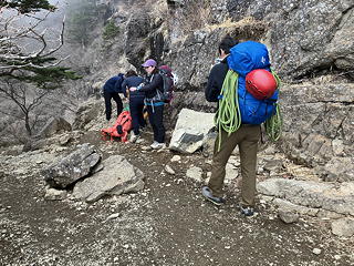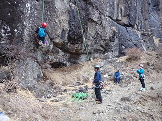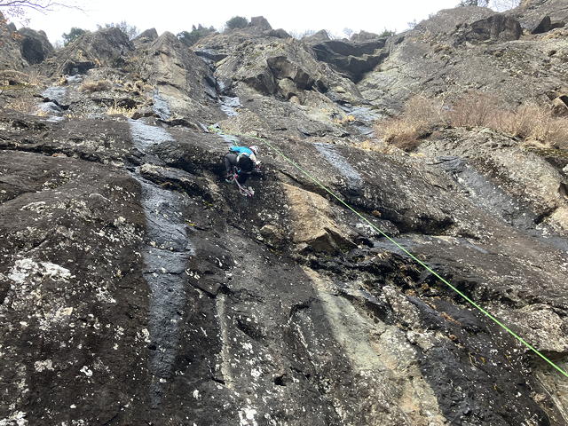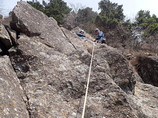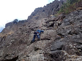 続いてこの日のメインイベントである人工登攀の練習に移り、まず直登カンテの1ピッチ目を私が登ってトップロープを張りました。ここを登るのは6年ぶりですが、ボルトの間隔は短いので登ること自体は易しいものの、何年前に設置されたかわからないリングボルトに体重をかけるときの緊張感は相変わらず。こういうところのリードでモノを言うのは、自分自身の「日頃の行い」に対する信頼感です。