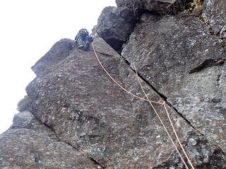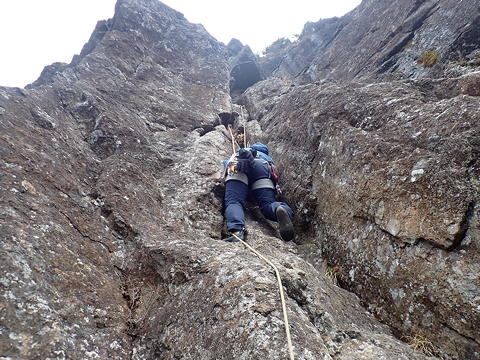 肝心の中央カンテの登攀は、kusutto氏が順調にロープを伸ばしてはMIHOさんと私を迎えることを繰り返し、核心部になる3ピッチ目も若干のぼやきは入ったものの危なげなくクリア。MIHOさんはさすがにここをフリーで登ることができませんでしたが、kusutto氏がセットしたカムを使ってのA0で抜けていきました。