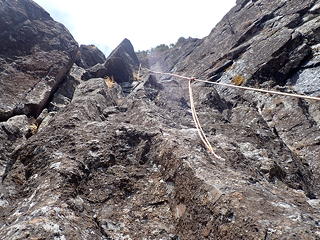こんな具合に短く切りながらの全4ピッチで無事にトップアウトし、懸垂下降は私が先行して、まず2ピッチ目終了点近くの懸垂下降支点へ降りたのですが、3人がここに揃ってからロープを引いてみると動きません。うわ、スタック?と焦りましたが、完全にスタックしたわけではなく摩擦で動きにくくなっているだけだったようで、kusutto氏と私が交代しながら渾身の力でロープを引き続けるとじわじわと動いてくれて、どうにかロープ回収に成功しました。やれやれ、どうなることかと思った。