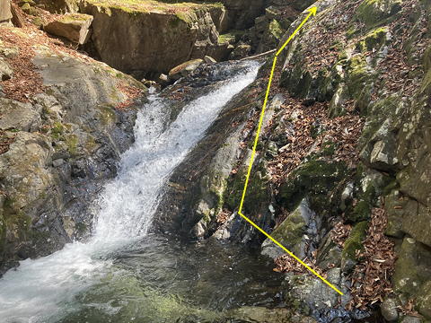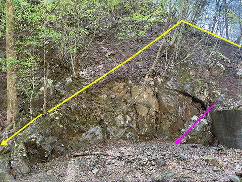 ▲高巻きのライン(黄色)と堰堤越えのライン(ピンク)。