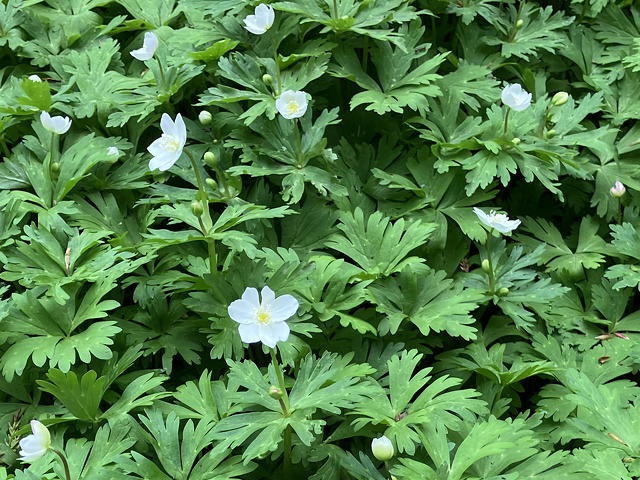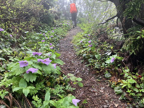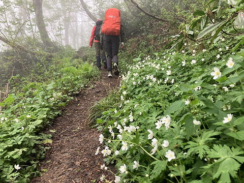 アオネバ十字路を過ぎるとイワカガミが目立つようになり、他の花々も密度が濃くなって、中には上の写真のニリンソウのように登山道の脇を同種の花が埋め尽くす場所も散見されるようになってきました。
