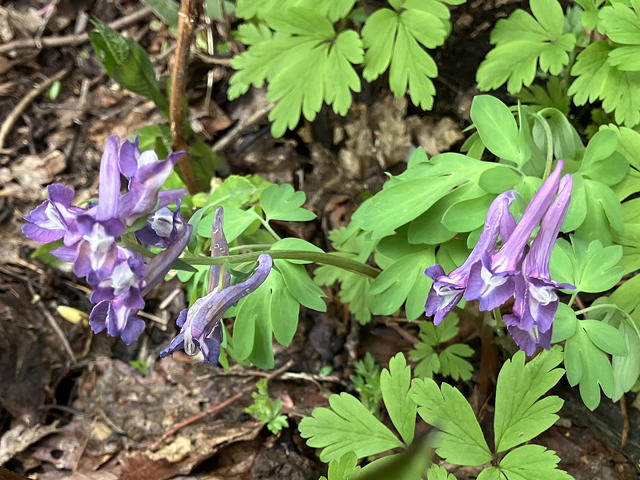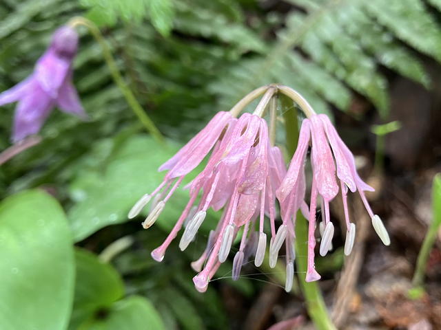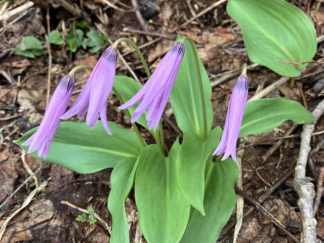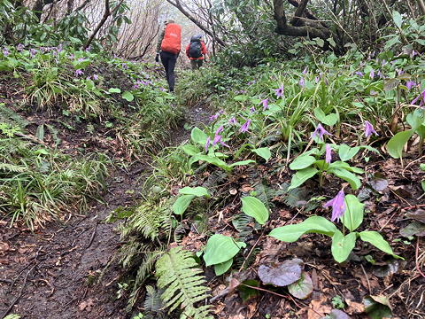 この縦走路は花の種類の多さもさることながら、特定の花の群生が随所に見られる点も魅力です。この区間では「カタクリ街道」(いず女史命名)が出現して、私がこれまでの生涯で見てきたカタクリの数を優に上回るほどでした。しかもこの縦走路のカタクリは咲き始めだからか花弁の開き方がそり返った形になっていないものが多く、葉に斑が入っていないのも特徴的です。