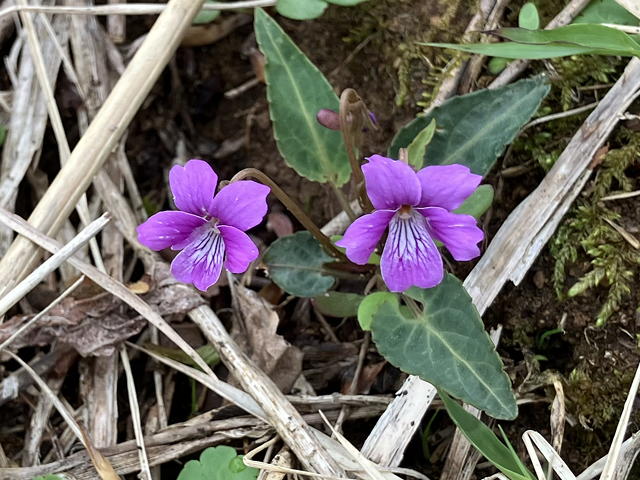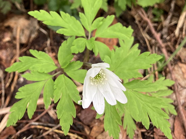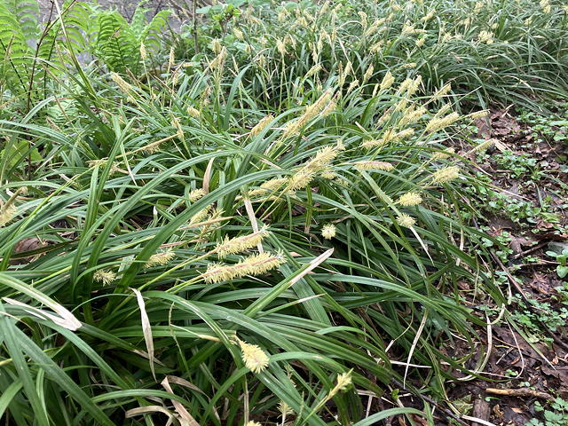 我々のほぼ2週間前に同じコースを歩いた山友トモミさんのレポートによれば、そのときのドンデン高原ロッジから金北山縦走路入口までの間の林道はほとんど雪に覆われていましたが、さすがにもう雪は溶けていて、すっかり薹が立ってしまったフキノトウたちと共に早くもスミレやカタクリ、シラネアオイ、ニリンソウ、アズマイチゲなどをまとまった形で見ることができ、さらに縦走路入口からアオネバ十字路までの間ではヒトリシズカやエンレイソウも目について、三人とものっけからテンションMAXになりました。また、使い古した歯ブラシ(←失礼)のような黄色い穂をつけた謎の植物もいやというほど繁茂していて「これはなんだ?」と不思議だったのですが、どうやらそれはカンスゲだったようです。