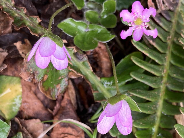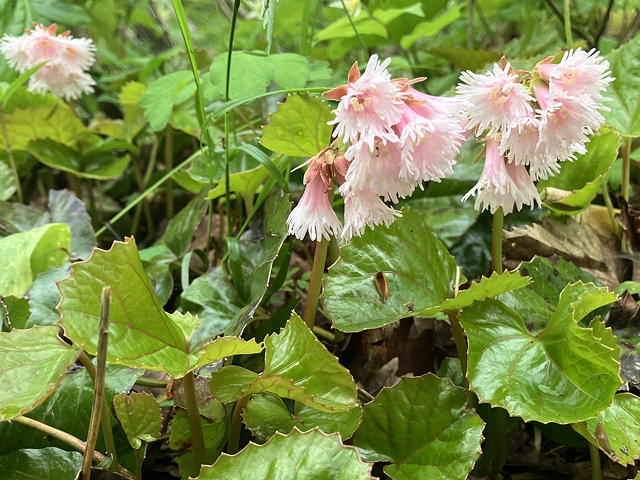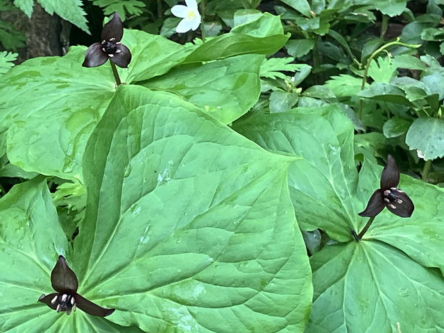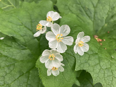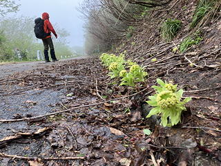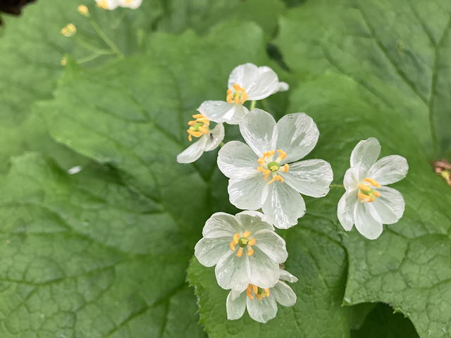 そうした中で今回の山行のハイライトとなったのは、このサンカヨウです。サンカヨウの花びらは乾いているときは白いのですが、低温高湿状態が続くと透明になることが知られていて、そのために「スケルトンフラワー」という別名を与えられています。我々が見たサンカヨウは完全な透明ではなく半透明の状態でしたが、それでもその佇まいは神秘的で、いず女史もトモエさんも大喜び。盛んに構図を変えながら写真を撮る二人の後ろ姿を眺めながら、私はといえば不謹慎なことにフグ刺し(てっさ)を連想していました。