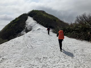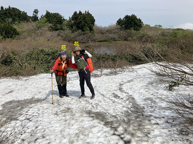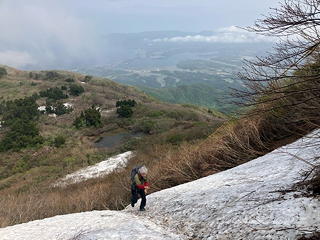 フィックスロープの斜面を越えるとしばらく水平な道(と言っても相当部分が雪の下)を進み、最後に再び雪の斜面を登れば待望の金北山山頂です。幸いにもこの頃になると雲がとれて国中平野とその向こうの小佐渡山地を眺められるようになり、おかげで縦走の完遂・花々の鑑賞・山頂からの展望の三拍子が揃った山行とすることができました。