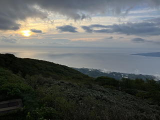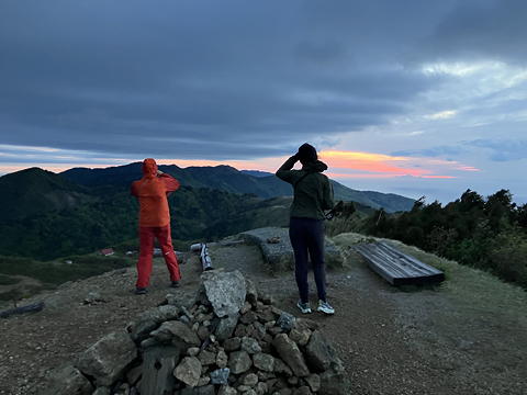 尻立山山頂から見る日の出を期待して4時少し前にロッジを出ましたが、樹林帯を抜けて草原地帯に入ると強風に煽られて怖いくらい。どうにかこうにか山頂に着いたもののじっと立っていることは難しく、山頂標識につかまったりベンチに座ったりしながら4時半の日の出を待ちました。
