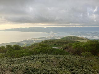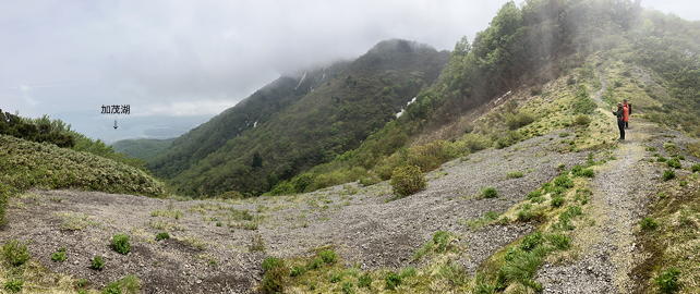 天狗の休場を通過する頃になって、雲が上がり下界が見下ろせるようになりました。そこに見えていたのは背後に加茂湖を控えさせた両津港で、稜線上から海が見えることで自分たちが島にいるのだということをあらためて実感しました。