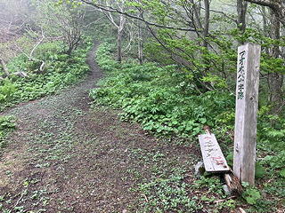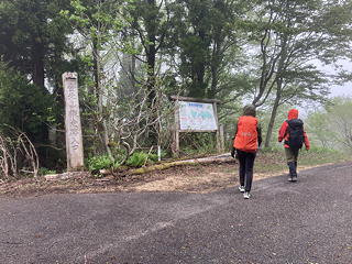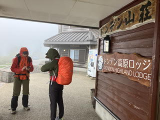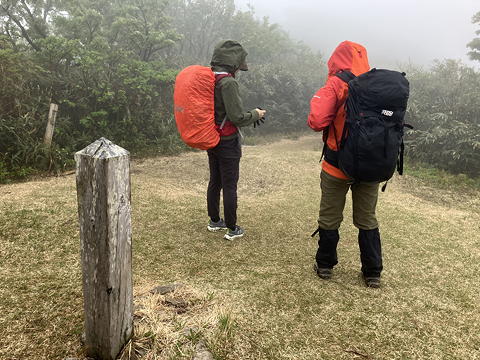 ……などと他人のことを気にしている場合ではありません。低気圧が遠ざかるにつれて等圧線の間隔が広がっていくはずだと考えた我々は8時出発を申し合わせていたのですが、その時刻になっても風は収まらないばかりか周囲はガスに覆われて、かえって日の出の頃より悪条件になっています。それでも最初のうちは車道だし、縦走路に入ってもしばらくは樹林帯の中なので、とにかくマトネまで行ってそこでの状況次第で縦走を継続するか往路を引き返すかを判断することにしようと覚悟を決めて出発しました。
