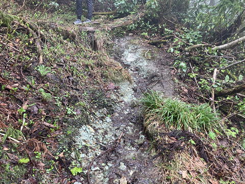 マトネの先ではさらに花の種類が増えて、エチゴキジムシロやニシキゴロモらしき花が現れました。また登山道上に現れた緑色凝灰岩(グリーンタフ)も不思議な色合いですが、これはアオネバ(青粘)の語源で、堆積した火山砕屑物が熱水による変質作用を受けて「緑泥石」という緑色の粘土鉱物を生じたものです。