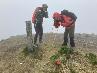 そうこうするうちにこの日の行動の判断ポイントとなるマトネ(笠峰)に到着しました。稜線上は雲の中に入っているらしく、相変わらず風が強くガスも濃いのものの、この程度なら歩行に支障はなさそう。アミノバイタルで気合いを入れ直してから、縦走を続行することにしました。