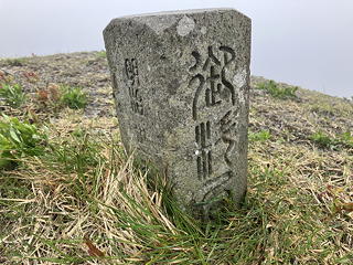 真砂の峰あたりは砂礫帯になっていて、晴れていればすばらしい展望を得られるところなのですが、今はホワイトバックの前でなかば耐風姿勢のようなポーズをとることしかできません。そんな我々を迎えてくれた標石は、篆書体も厳かな明治時代の宮内省御料局のもの。御料局ということは(丹沢に「御料林」があったのと同じように)この地が皇室に属する御料地であったことを示しています。