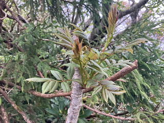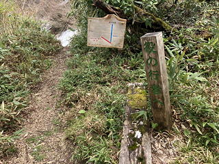 やがて道が二手に分かれるポイントに到達しました。前回歩いた左の道は山腹をトラバースして役行者の石像から鏡池を通りますが、試みに左の道を覗いてみると斜面にびっしり雪がついていてこれを横断するのは難儀なことになりそう。そこで今回は素直に尾根上を行く直進ルートをとったところ、その途上にこの日唯一のタラノキが見つかりました。そこについているタラの芽もいささか伸びすぎのようではありましたが、そもそも外来の登山者である我々が山の幸を勝手に採るのはいかがなものかという気持ちが働き、これに手を出すことは控えました。