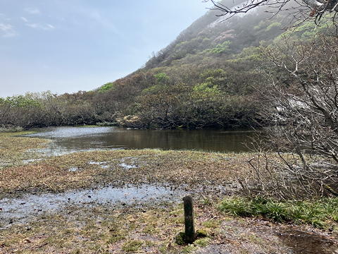 やがて二つのコースが合流した先にあやめ池が現れて、周囲の登山道も雪解け水で水浸しでした。そしてここから前方の金北山を見上げると、雪に覆われた急な斜面を先行する登山者が登っているのが見えました。