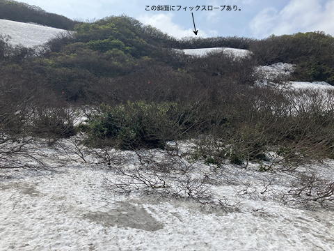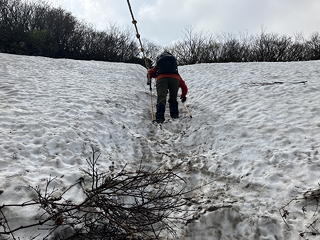 ここまで縦走路上に難所らしいところは皆無でしたが、この雪に覆われた斜面に限っては歯応えが感じられます。まずはところどころに付けられたピンクテープを目印に斜面を進みましたが、ところによっては登山道に中途半端に雪が残っているためにそれを迂回しなければならず、木の枝や幹をつかんで身体を引き上げるために腕力を使う場面がありました。