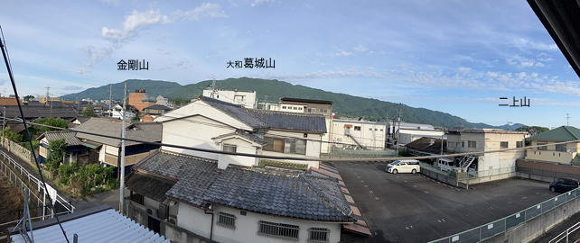 いかにもローカルな御所駅の跨線橋から西の金剛山地を眺めると、正面に大和葛城山、その左(南)に金剛山、右(北)の端には二上山が見えています。実はプランニングの段階では二上山から金剛山までを一気に歩き通すことを検討したのですが、この日の帰京のことを考えると時間にゆとりがないことと、やはりこの山は大津皇子の故事を偲びつつ心静かに登りたいような気がしたので、今回はパスすることにしました。