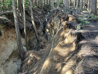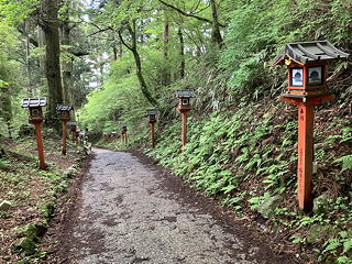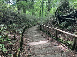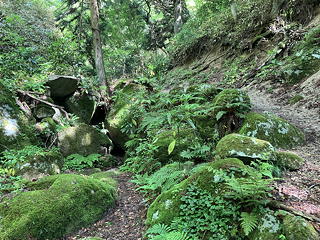 それにしてもこのコースは傾斜がきつい。植林地の中の登山道は驚くほどの鉄砲登りが続き、そのためかどうか古い道は浸食を受けて深くえぐられてその脇に登山道が付け替えられている様子が窺えました。そんな道を頑張ること約1時間、ようやく傾斜が緩んで岩が柔らかい苔に覆われるようになれば、山頂周辺の道路まであと少しです。