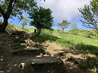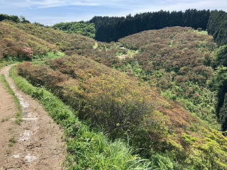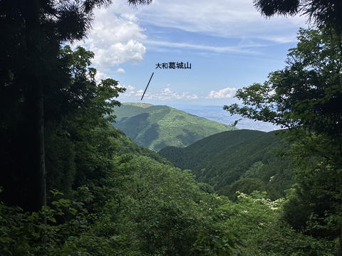 旧パノラマ台から先は尾根上を緩やかに進む穏やかな登山道になっており、その途中で振り返ると3時間前にそこにいた大和葛城山が見えました。これが半月前なら、あの奥の斜面はツツジのピンクに染まっていたに違いありません。