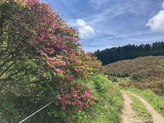 しばらく山岳展望を楽しんでから南に向かうと、斜面にはほとんど花を落としたツツジが一面に広がっていました。それでも一株二株くらいはピンクの花をつけているのを見て、どうせ来るなら半月前に訪れればよかったと後悔しました。しかし、このツツジ園を通り抜けて少し進んだところにパラグライダー広場があり、そこから見下ろす飛鳥地方の眺めはこの上なく美しくて息を呑みました。まさに、倭建命の望郷の歌に歌われたとおりです。