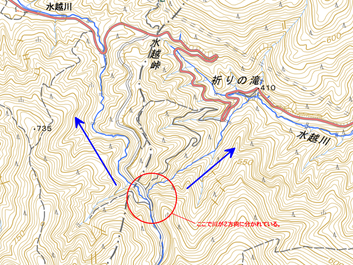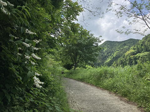 水越峠からしばらくはセメントで固められた車道になっており、白いウツギの花がその両脇に鈴なりに花をつけています。この道の右側の谷は北上して水越峠の近くで西(大阪府)に向かう水越川ですが、後で地形図を見ているうちに、この少し上流で川が東(奈良県)側にも分かれており、そちらも水越川と名付けられていることに気がつきました。