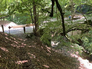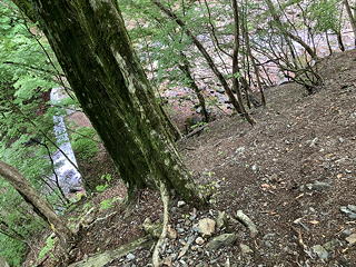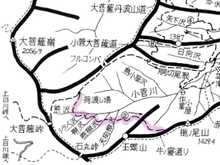 - ^標高1690mで沢を横断するこの「山道」は水源巡視路で、大菩薩道のニワタシバから小菅川源流をぐるっと回って牛ノ寝通りの玉蝶山と榧ノ尾山の間に通じています。大菩薩峠に出ることなく遡行を早めに終了して起点に戻りたければ、この道を右(左岸)方向へ辿ってニワタシバに出るのが簡便です。なお、先日買い求めた『バリエーションハイキング』(新ハイキング社 2012年 松浦隆康著)p.257(「小菅川の最源流」の項)はこの道を
